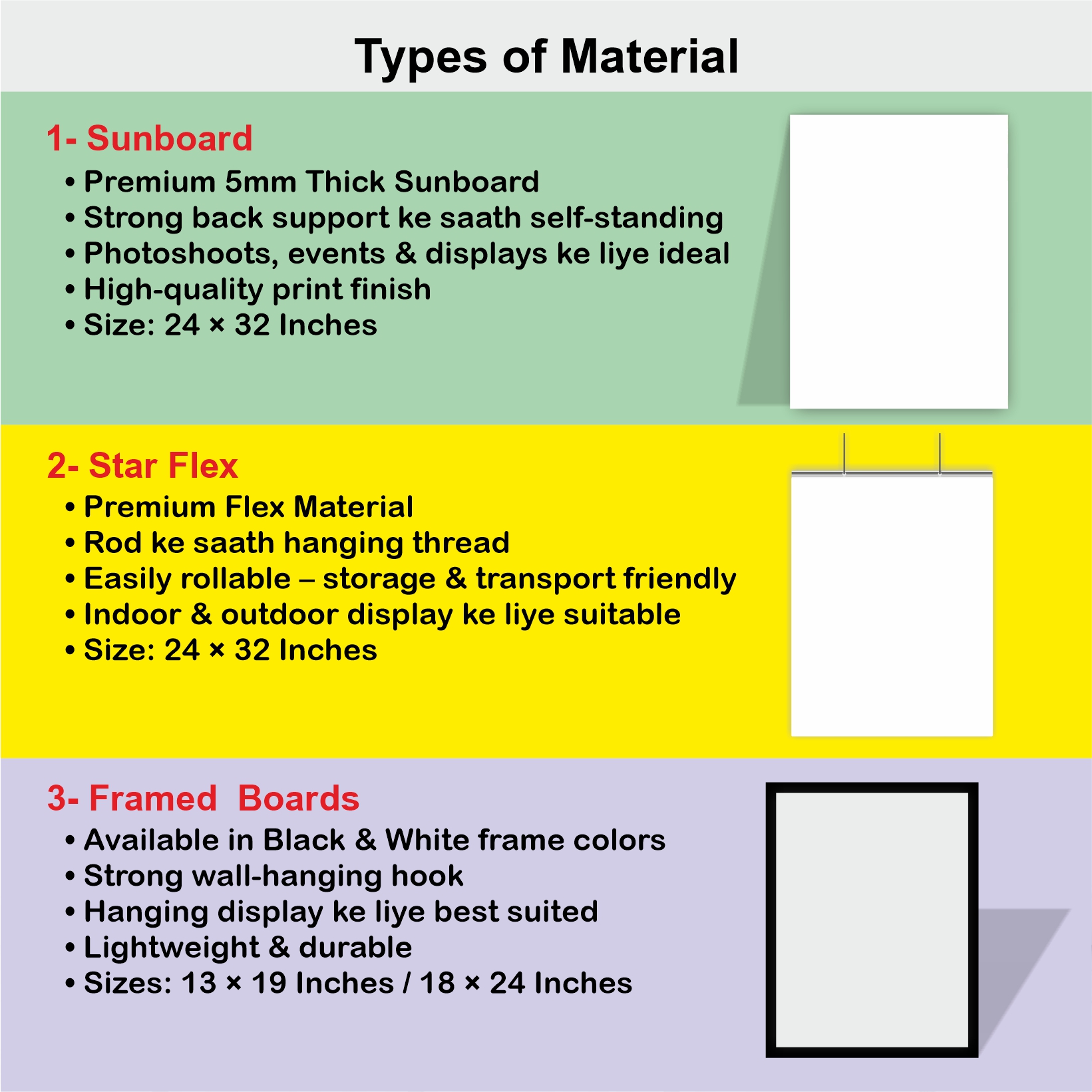 | Material | Soft Copy, Star Flex 24 inch x 32 inch, Hard Board 24 inch x 32 inch, Frame 13 inch x 19 inch, Frame 18 inch x 24 inch |